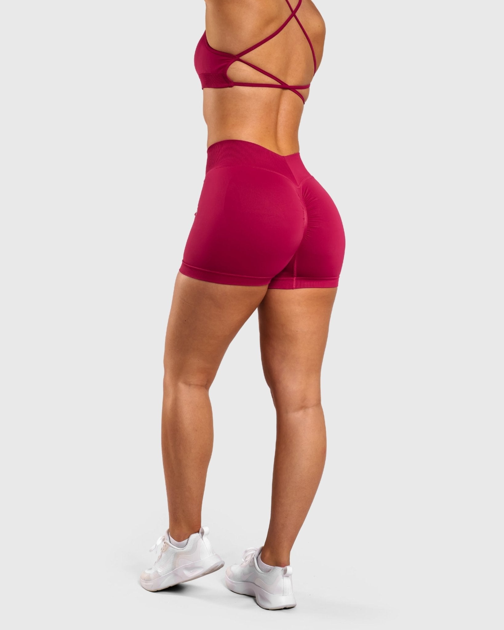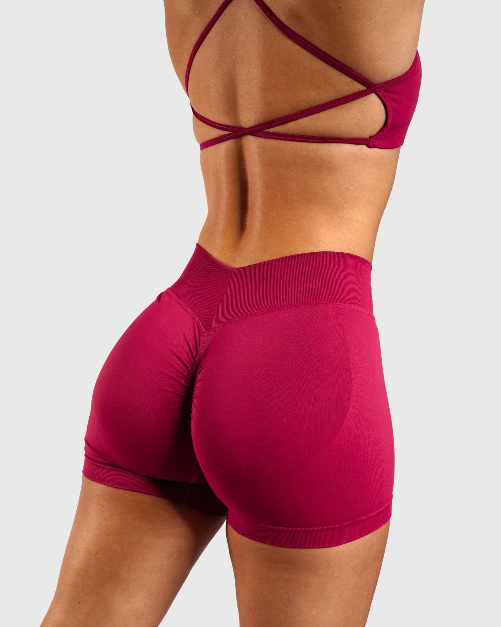 The shorts have a low to medium waist and shorter leg length, made of medium thick fabric with scrunch and V-shaped waist at the back for a flattering fit.