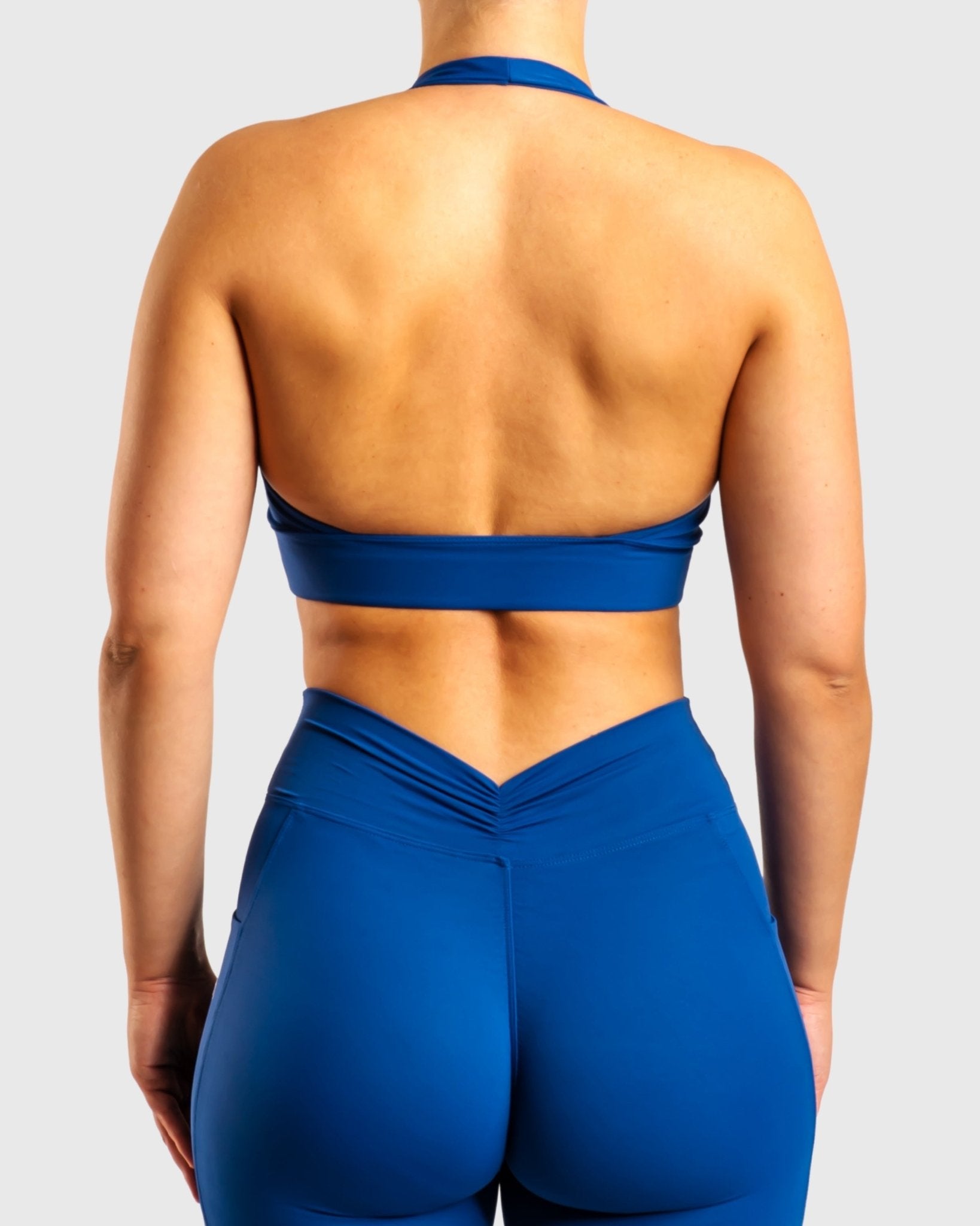 Experience the perfect blend of style and support with our Pulse sports bra. This halterneck bra features an open back, and at the front it has a subtle heart-shaped design with a delicate scrunch detail.